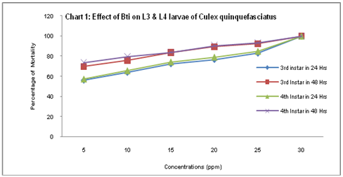 Abstract: Objectives: Biological control strategies for the filarial vector Culex quinquefasciatus using Bacillus thuringiensis israelensis (Bti) and Gambusia affinis. Methods: The potential of Bti as a bio-control agent was investigated under laboratory conditions. Bti strain H-14 when assayed for its residual toxicity against Culex quinquefasciatus revealed that the susceptibility status varies according to the developmental stage of the vector. Various Sizes of Gambusia affinis were taken to evaluate the consumption of Culex quinquefasciatus. Results: Culex quinquefasciatus larvae appeared highly sensitive for the higher concentrations (ppm) of Bti; various sizes of Gambusia affinis consumed Culex quinquefasciatus as potential larvicidal agent. Conclusion: The present investigation clearly exhibits that both Bacillus thuringiensis israelensis and Gambusia affinis serve as a potential larvicidal agent.
