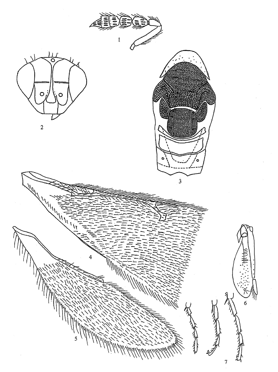 Plate: Diglyphus horticola Khan female 1. Antenna; 2. Head in frontal view; 3. Thorax; 4. Fore wing; 5. Hind wing; 6. ovipositor; 7. Legs (Fore leg, Mid leg and Hind leg).